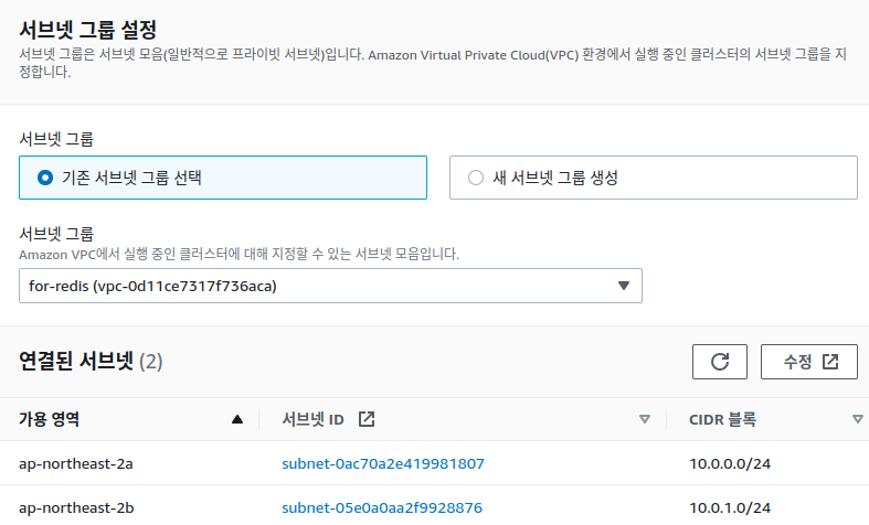 서브넷 그룹은 vpc를 새로 생성해서 지정했다. 이 서브넷들은 나중에 ecs 노드들이 생성될 곳이기도 하다.